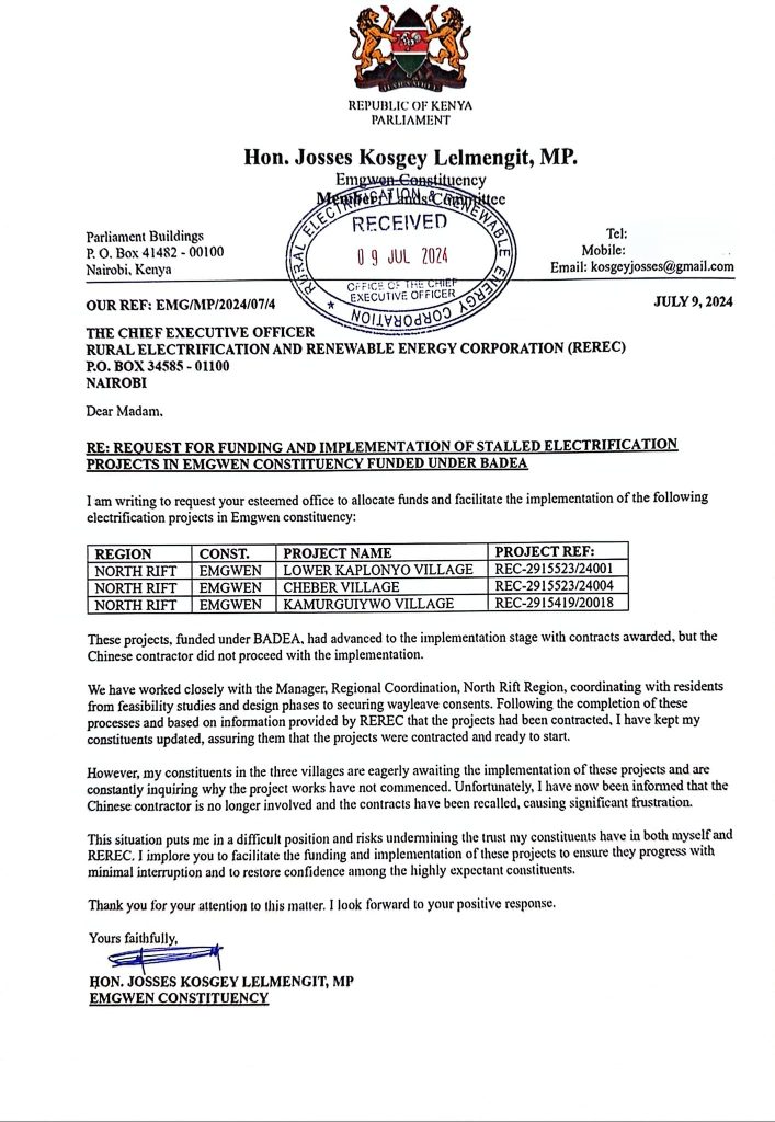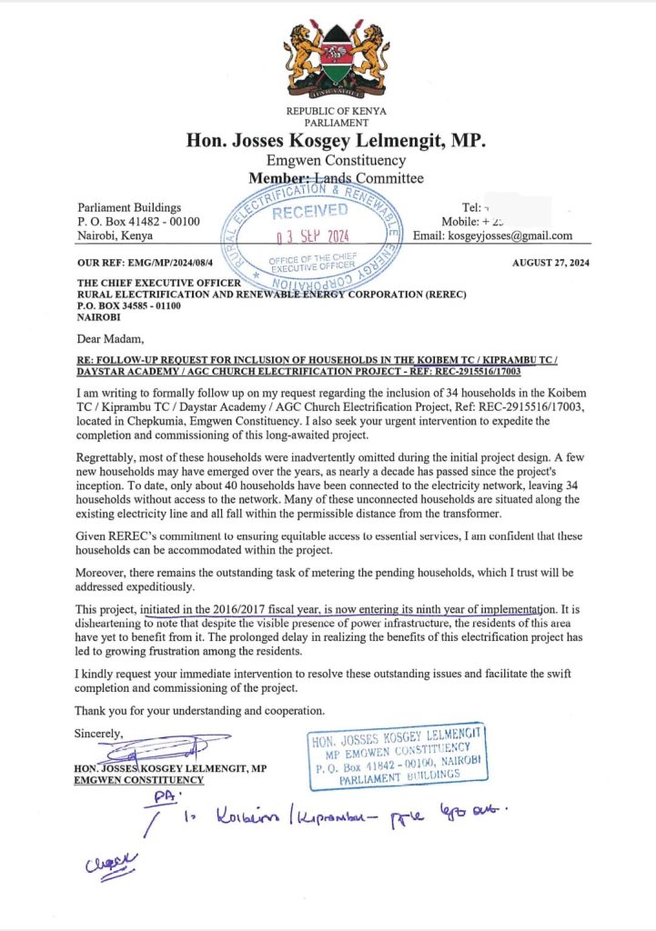 Today, I had a series of productive meetings in Nairobi to address critical electrification issues affecting Emgwen Constituency. In my meeting with Dr. Rose Mkalama, CEO of REREC, we focused on several key projects: 1. Extension of the Arwos – Kaboch Electrification Project: We discussed the need to connect 15 isolated households that were not reached. The cost estimates for extending the project, which includes installing a new transformer, are complete. The next step will be the design phase. 2. Addressing Alleged Misconduct: I raised concerns about alleged misconduct and malpractice by the contractor and supervisor in the Arwos – Kaboch project, specifically regarding reported demands for bribes to connect households beyond the 600-meter transformer radius. 3. Kapchumba Electrification Project: Concerns were highlighted regarding substandard and incomplete work by the contractor. This issue will be closely monitored to ensure the project meets required standards. 4. Wayleave Issues in Kapsean: We discussed resolving the wayleave issues in the Kapsean Electrification Project, which are delaying the connection of 18 pending households. 5. Brightstar Academy – Kiprambu Electrification Project: I advocated for the inclusion of 34 households that were reportedly left out. A surveyor will visit the site within the week to assess the situation. We also focused on the need for metering pending households and ensuring swift completion and commissioning of the project. 6. Funding for Key Projects: I emphasized the urgent need to secure funding and resume implementation of the Kamurguiywo, Lower Kaplonyo, and Cheber electrification projects. These projects, initially funded by the Arab Bank for Economic Development (BADEA), were halted after funding was withdrawn. They are now a top priority and will be funded and assigned a new contractor. 7. Pipeline Projects: We also reviewed upcoming projects that will benefit our constituency. Later, I also met with Dr. (Eng.) Joseph Siror, MD & CEO of KPLC, to discuss additional pressing matters: 1. Resumption of the Kabore Electrification Project: We discussed the stalled project, which is pending the resolution of contractual issues currently in court. 2. Kapsabet Girls Street Light Project: I requested the installation of additional street lights in Kapsabet Girls and along the Kapsabet Girls Irimis Road as part of the ongoing street lighting project. 3. Unexplained Disconnection of Households in Kaptendon: I addressed the concerns regarding the sudden disconnection of multiple households, which will be investigated and resolved. 4. Expediting Metering for Ongoing Projects: We emphasized the importance of speeding up the metering process across ongoing electrification projects in the constituency. These discussions were focused on ensuring that the needs of our community are met efficiently and effectively. I am committed to seeing these projects through to completion, and I will continue to advocate for the swift resolution of these issues.